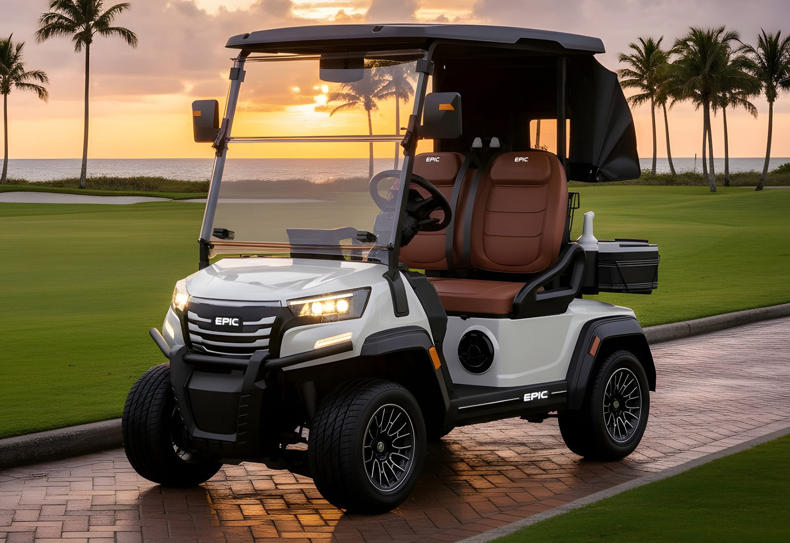 The brand new Epic E20FX golf cart model is creating quite the buzz industry-wide! Furnished with every desirable feature, this two-seater Epic golf cart comes in seven stylish metallic colors. Premium 12” turf friendly tires provide a super smooth and enjoyable ride on and off the golf course. With a top of the line built-in marine-grade sound system, stunning accent lighting, and a rear golf kit with two coolers, two sand bottles, and two golf bag holders, and golf bag rain cover, this Epic E20FX golf cart will make you the envy of every golfer on and off the course!